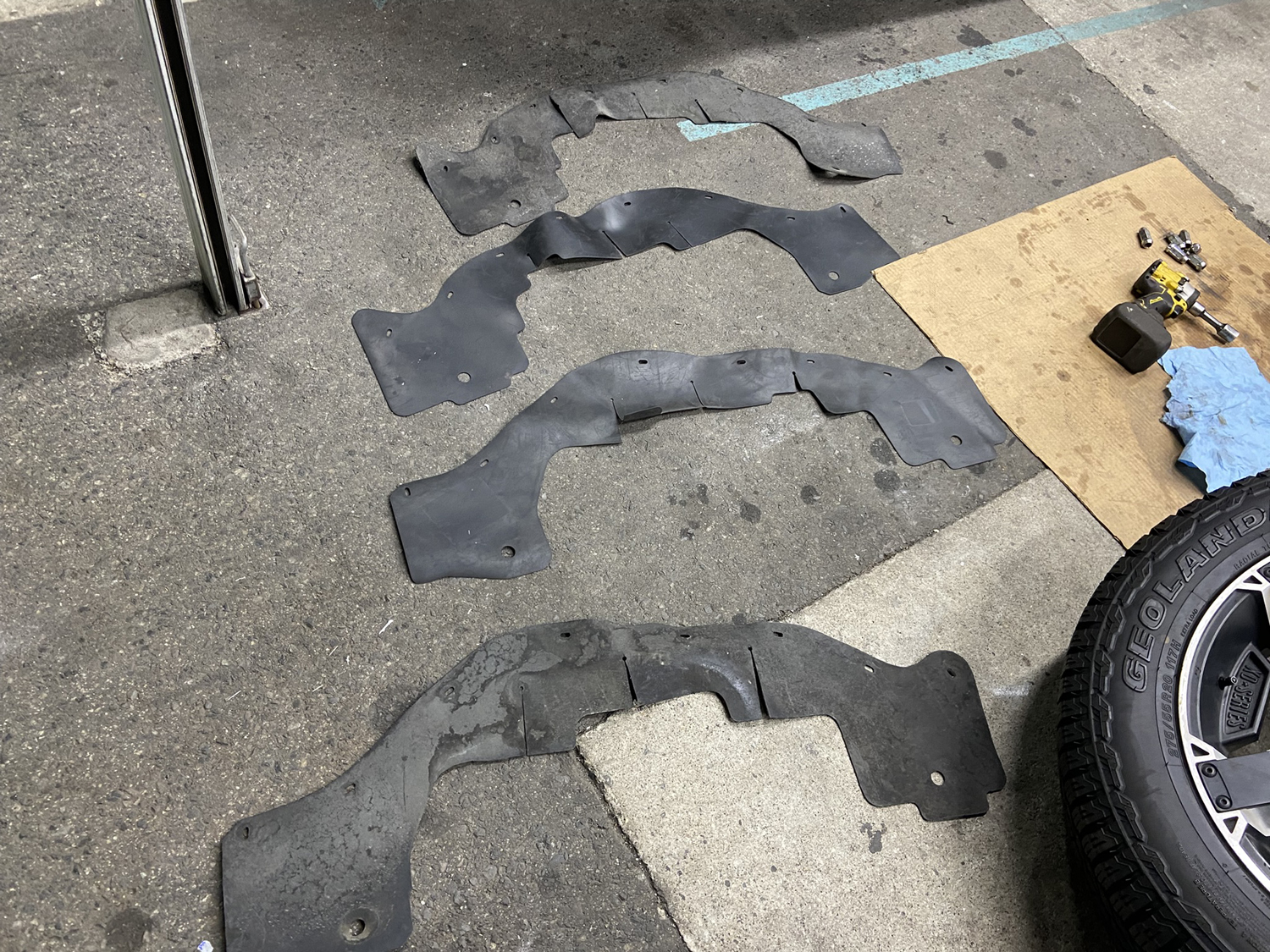 切れかけのフロントタイヤハウス内スプラッシュシールド。