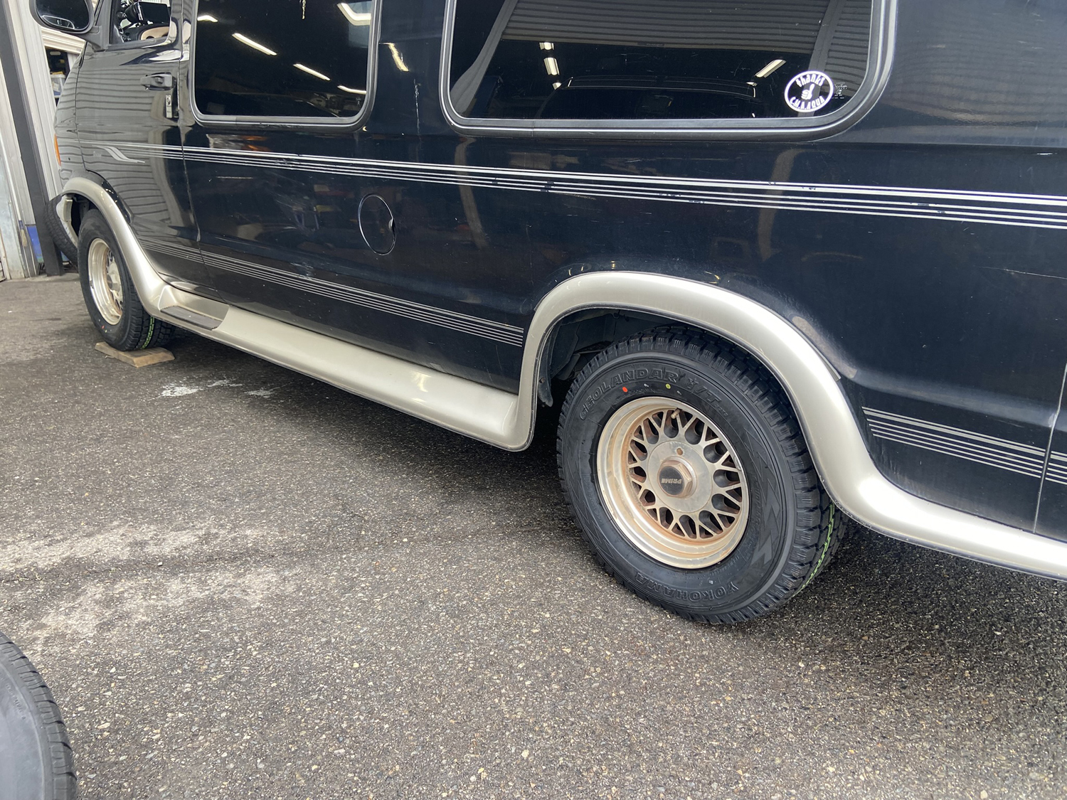 古いデザインのアルミホイールに新品スタッドレスをセット。